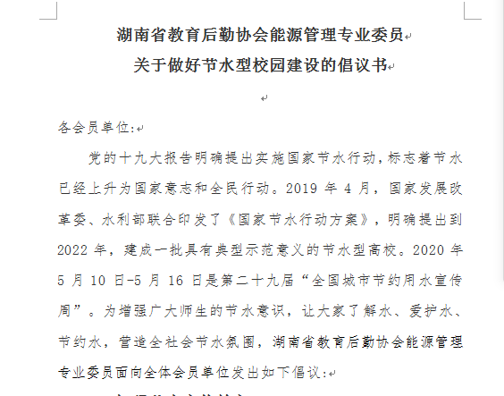 5月10日,能專會向各會員單位發(fā)出了節(jié)水倡議書,倡導大家在加強節(jié)水教育、強化用水精細化管理、加強漏損控制、提高非常規(guī)水利用、積極開展節(jié)水改造等方面多多努力,為建設節(jié)水型城市、節(jié)水型校園貢獻自己的力量。