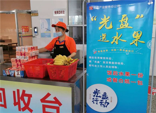 在校區(qū)食堂的餐具回收處,后勤設(shè)立了“光盤換水果”贈送點,每位前來就餐的師生都可憑借吃光的餐盤領(lǐng)取一份水果或一包紙巾,活動開展以來,取得了較好的效果。